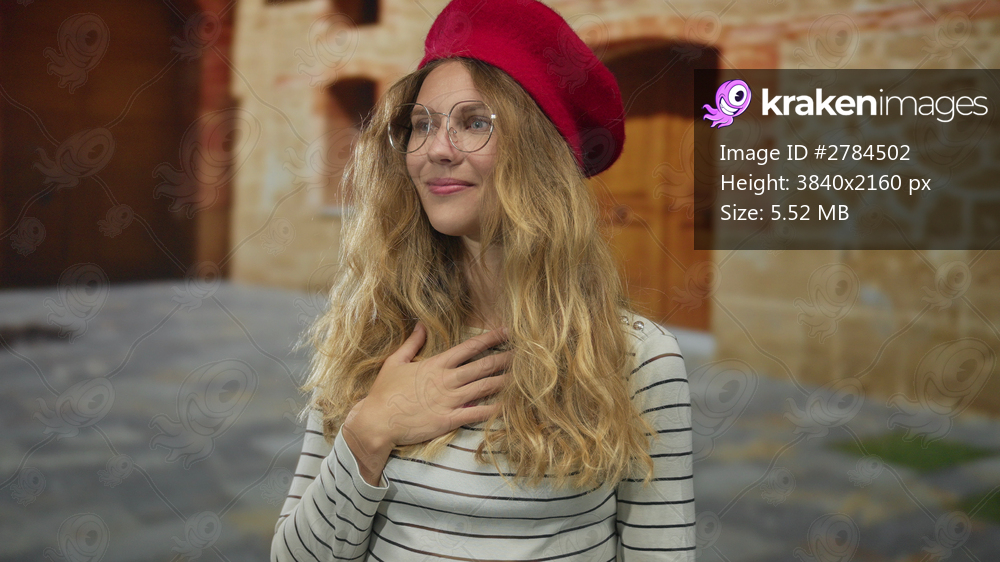 Woman touches hand to chest with a grateful look on street in a blonde beret and glasses, striped shirt and casual smile.