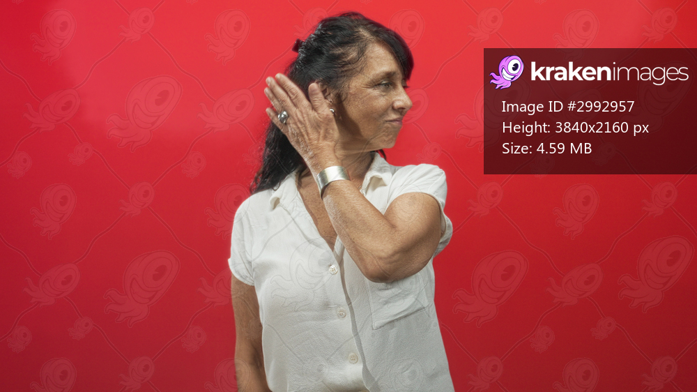 Woman touches her hair with hand in a red studio wearing white blouse and necklace, bracelet and ring; quiet confidence.