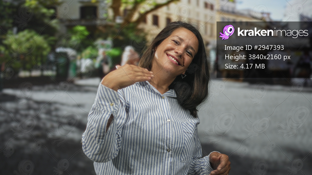 Woman touches her hand to chest and smiles broadly in street plaza, tilting head and gesturing with other hand in outdoor market; joyful warmth.