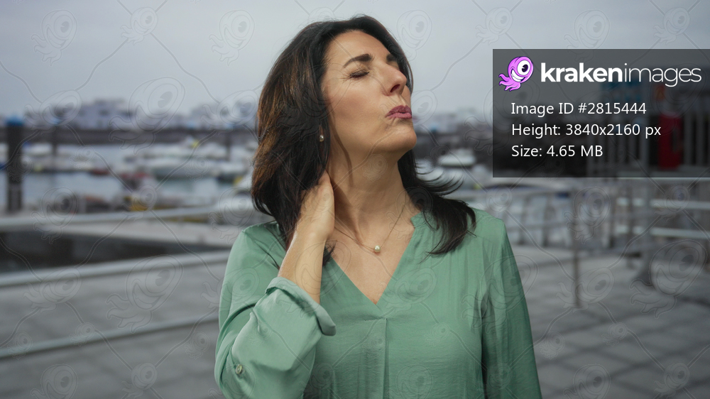 Woman touches her neck, pushes dark hair behind her ear, and closes her eyes on a port street by fishing boats; serenity.