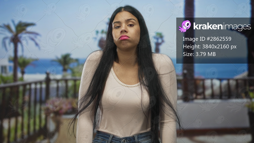 Woman touches neck with hand on building balcony among tall palm trees under bright sunlight; frustration.