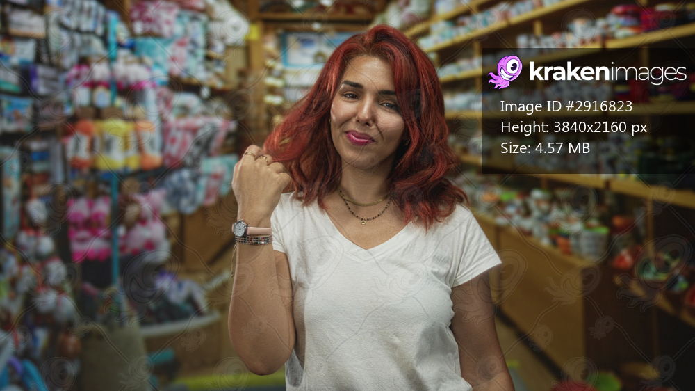 Woman touches neck and smiles while standing in a shop building aisle with crowded shelves of goods; confidence small business.