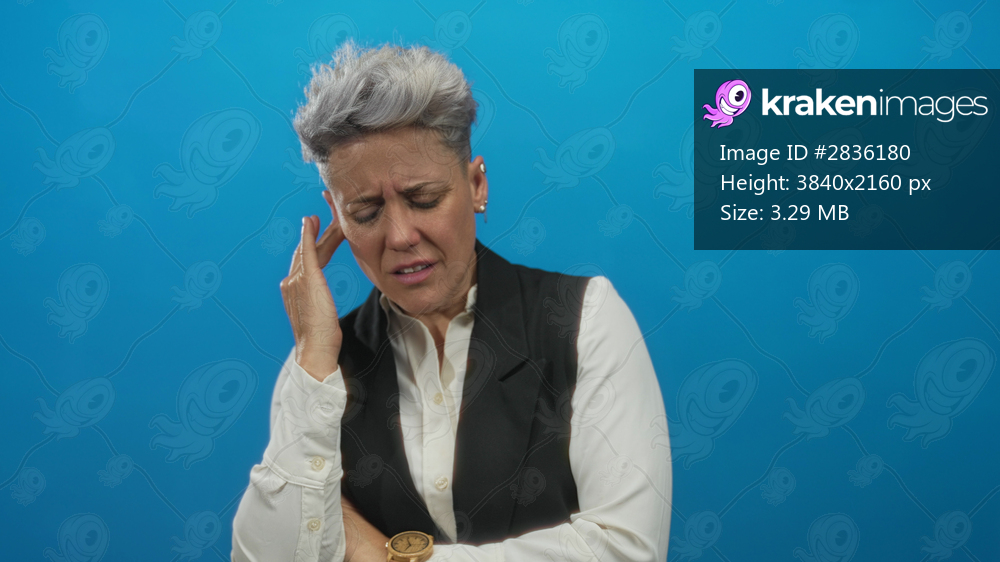 Woman touches temple in studio with closed eyes and furrowed brow, pressing her hand to her head in tense gesture; discomfort.