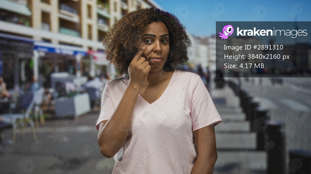 Woman touching cheek with finger under her eye on a busy city street near cafe seating and bollards, wearing light pink tshirt looking uneasy; pensive concern. - Kraken Images