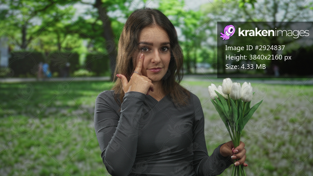Woman touching cheek with finger while holding white tulips in forest park setting outdoors; calm reflection.