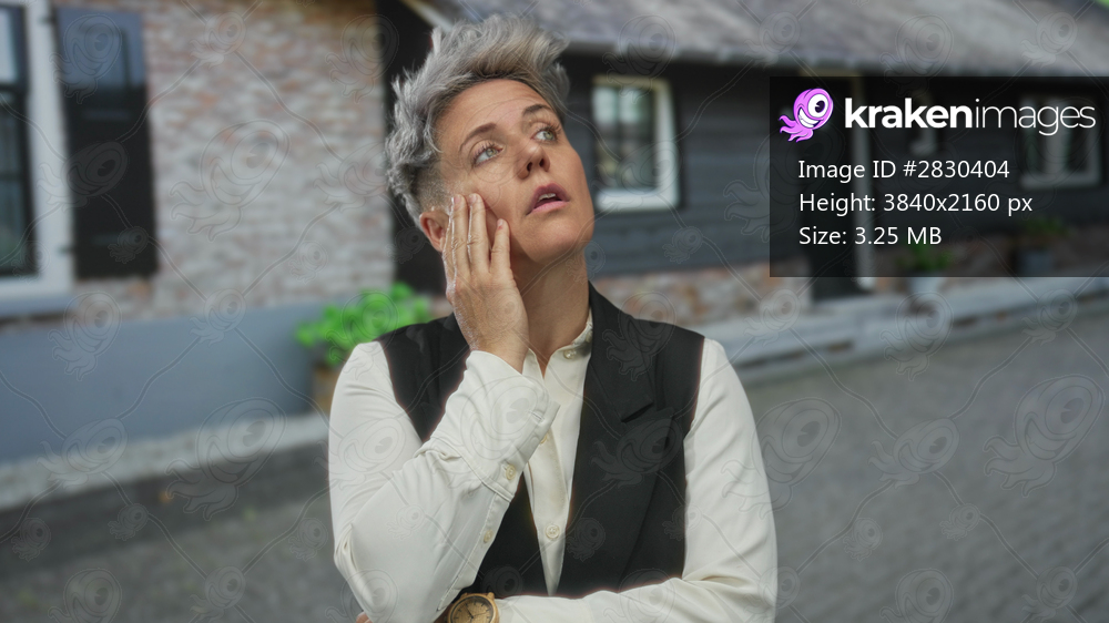 Woman touching cheek with hand at building entrance outdoors, looking thoughtful in white shirt and black vest; pondering.