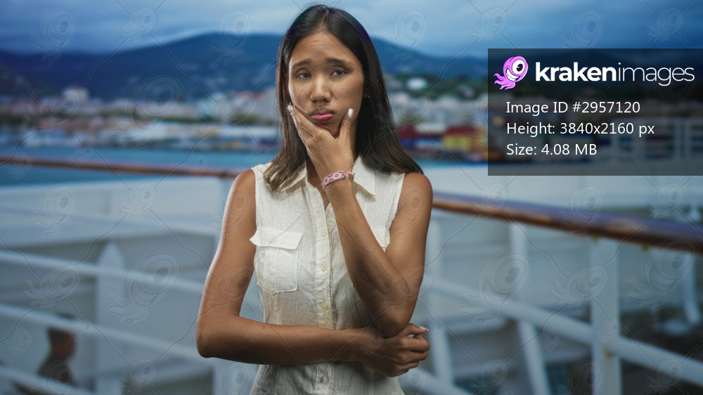 Woman touching cheek with hand for toothache on cruise deck near coastal building; quiet discomfort.