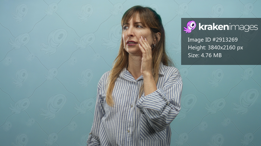 Woman touching cheek with hand in light blue studio wearing striped shirt and hoop earring; pensive reflection.