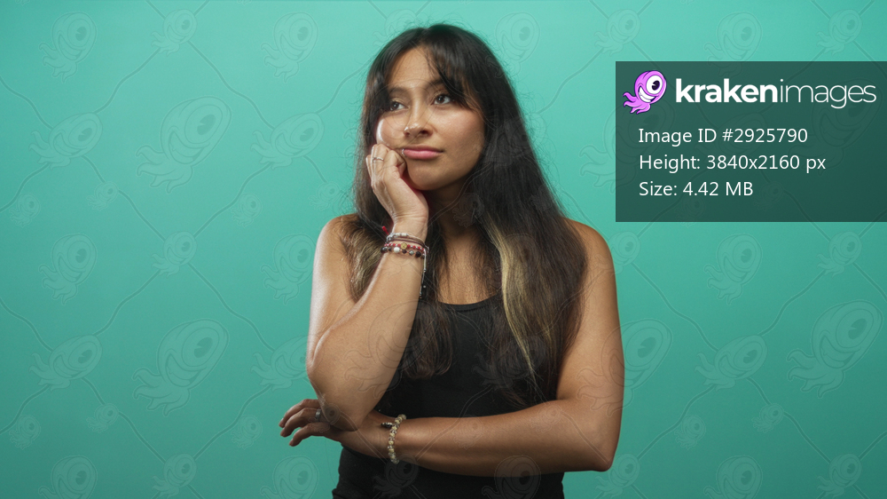 Woman touching cheek with hand in teal studio while wearing a black tank top and bracelets; thoughtful reflection.