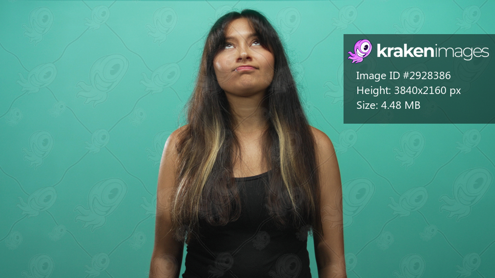 Woman touching cheek with hand in teal studio while wearing a black tank top and bracelets; thoughtful reflection.