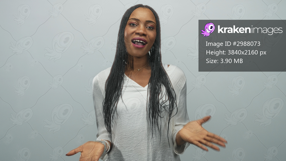 Woman touching cheeks with hands and smiling, wearing white shirt and bracelets, posed against plain studio wall; joyful connection.