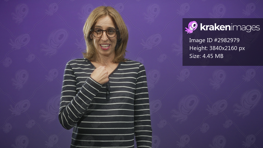 Woman touching chest with hand in studio wearing glasses and striped shirt, smiling and making a welcoming wave; gratitude warmth.