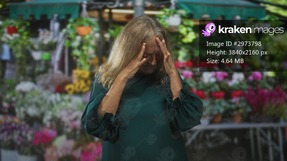 Woman touching chest and pressing forehead with both hands amid colorful potted flowers at a market stall on a street; gratitude.