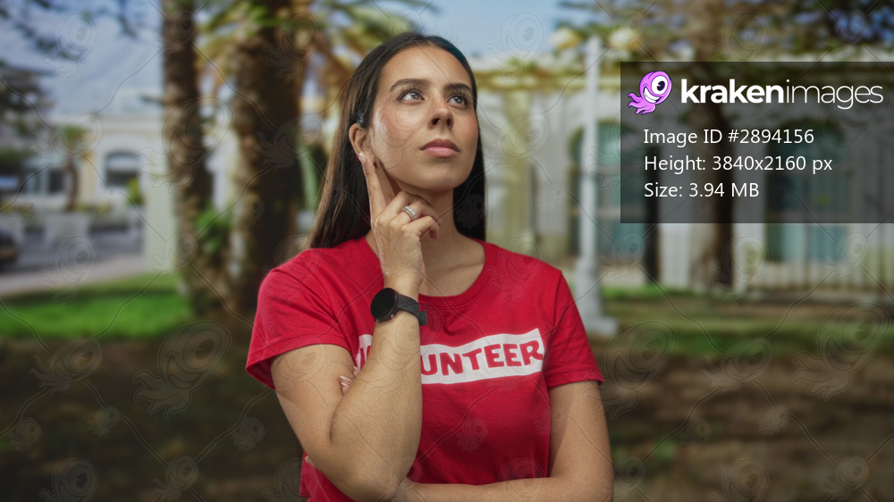 Woman touching chin at building wearing volunteer tshirt and smartwatch with folded arms under palm trees; thoughtful reflection.