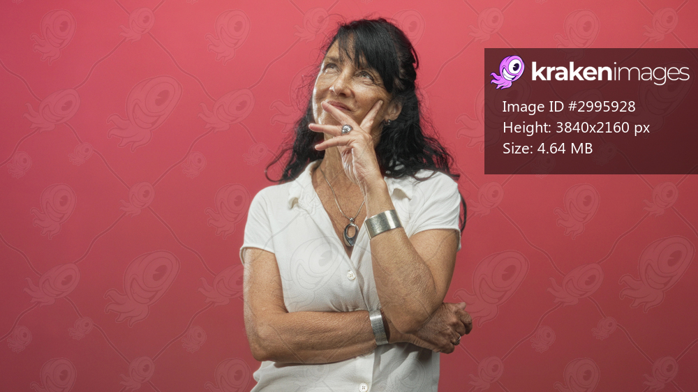 Woman touching chin with fingers, arms crossed, wearing white shirt and silver bracelets in studio; thoughtful reflection.
