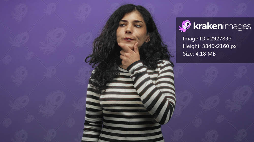 Woman touching chin with hand, brunette in striped shirt, posing with thoughtful face in purple studio; pensive reflection thought.