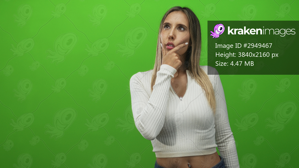 Woman touching chin with hand and exposed navel piercing in green studio wearing white ribbed top and jeans; thoughtful contemplation.