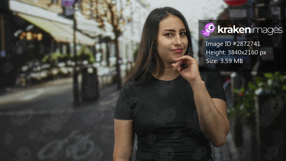 Woman touching chin with hand on a busy city street wearing black tshirt and standing near sidewalk; quiet contemplation.