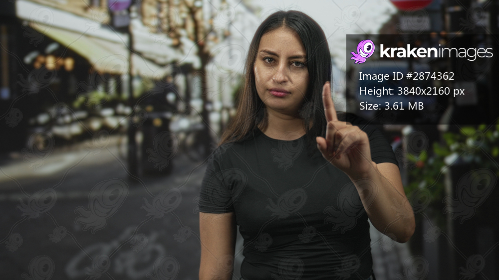 Woman touching chin with hand on a busy city street wearing black tshirt and standing near sidewalk; quiet contemplation.