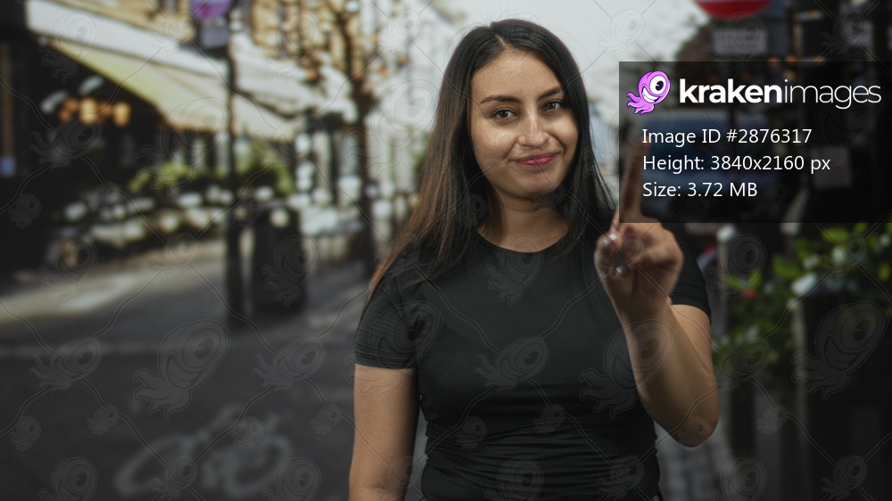 Woman touching chin with hand on a busy city street wearing black tshirt and standing near sidewalk; quiet contemplation.