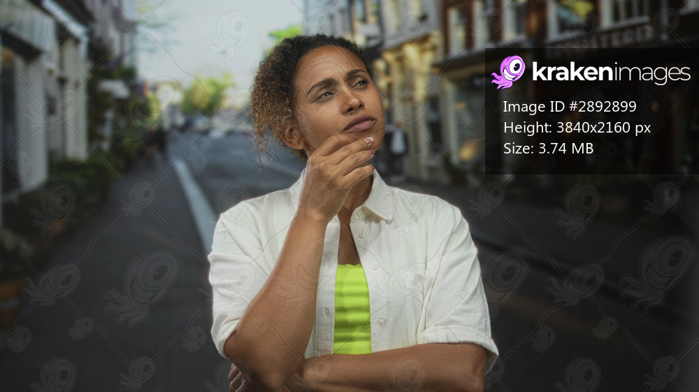Woman touching chin with hand on street, arms crossed, wearing white shirt and neon green top near cafe building in daylight; contemplation.