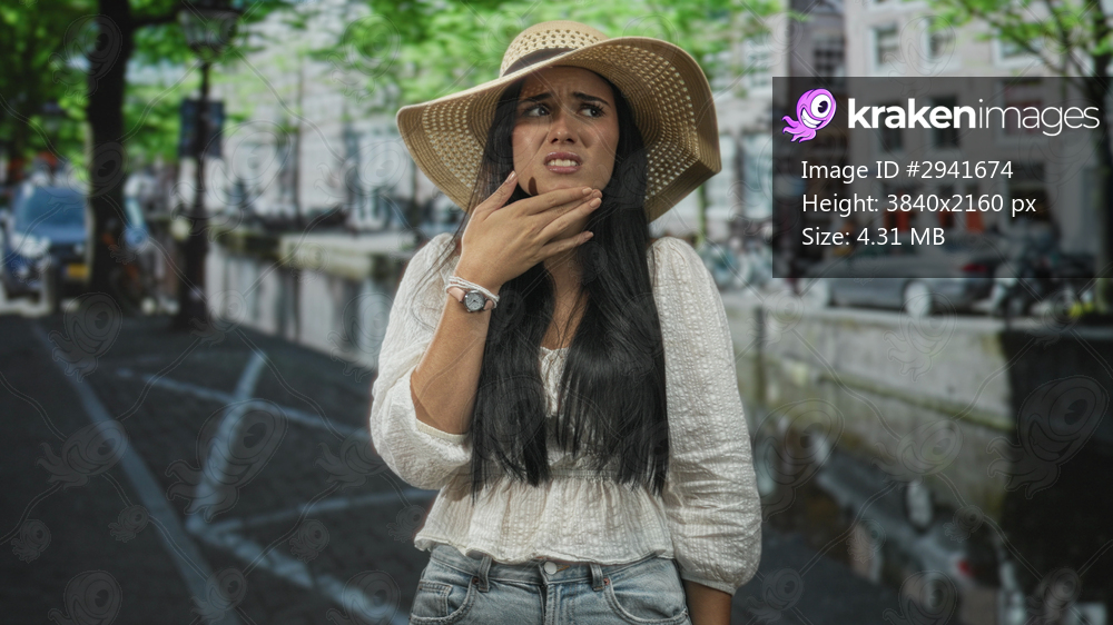 Woman touching chin with hand on street beside a canal and city buildings, wearing straw hat, white blouse and jeans; concern uncertainty.