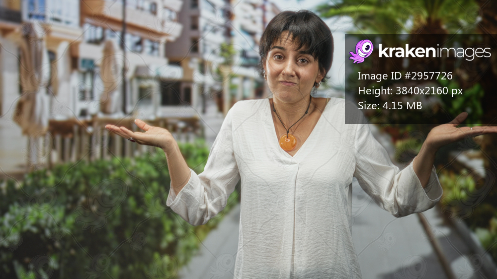 Woman touching chin with hand and rings, wearing orange pendant and white blouse, moving from shrug to thinking on street cafe promenade lined with palms and hedges; uncertainty decision. - Kraken Images