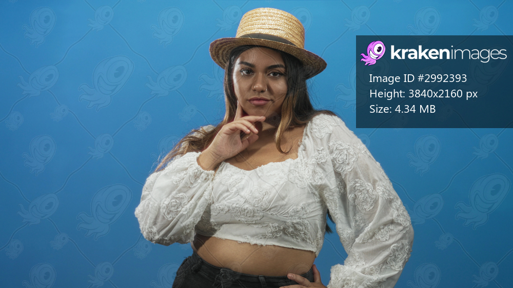 Woman touching chin with hand while wearing straw hat and white embroidered crop top in studio; thoughtful confidence pose.