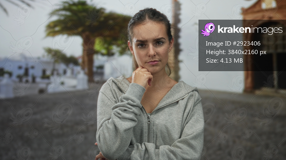 Woman touching chin in front of a building on a street, wearing gray hoodie and crossing arms while gazing forward; pensive reflection.