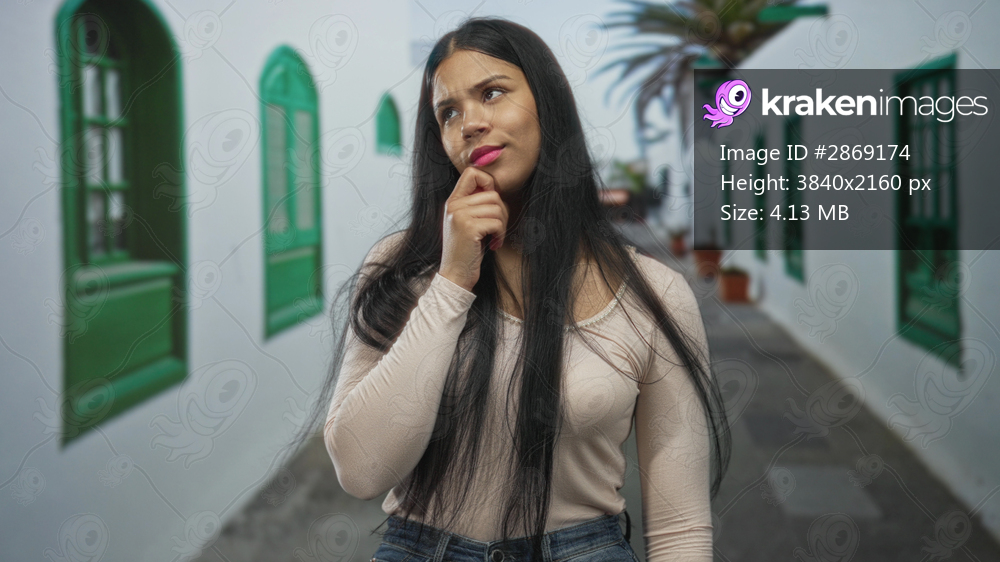 Woman touching chin in narrow alley street flanked by white buildings with green shutters and palm tree; curiosity.