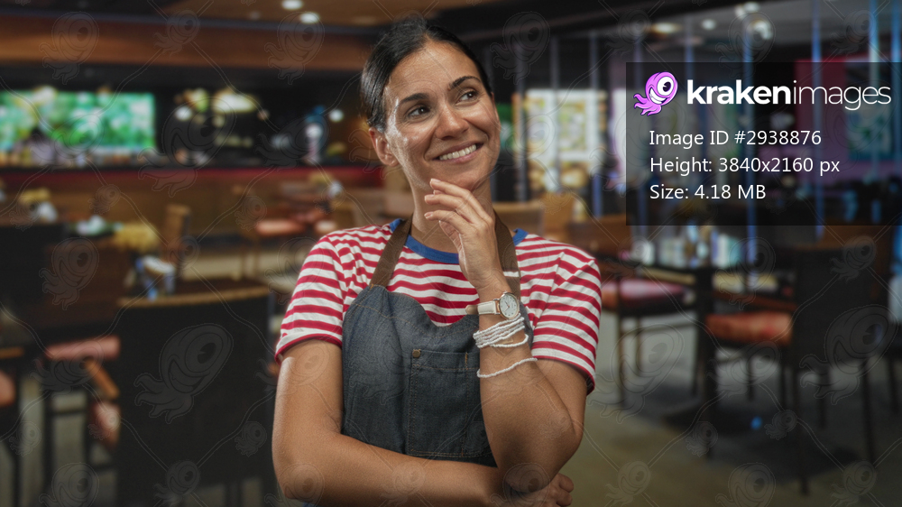 Woman touching chin and smiling, wearing denim apron and striped red shirt in a restaurant building interior; thoughtful planning.