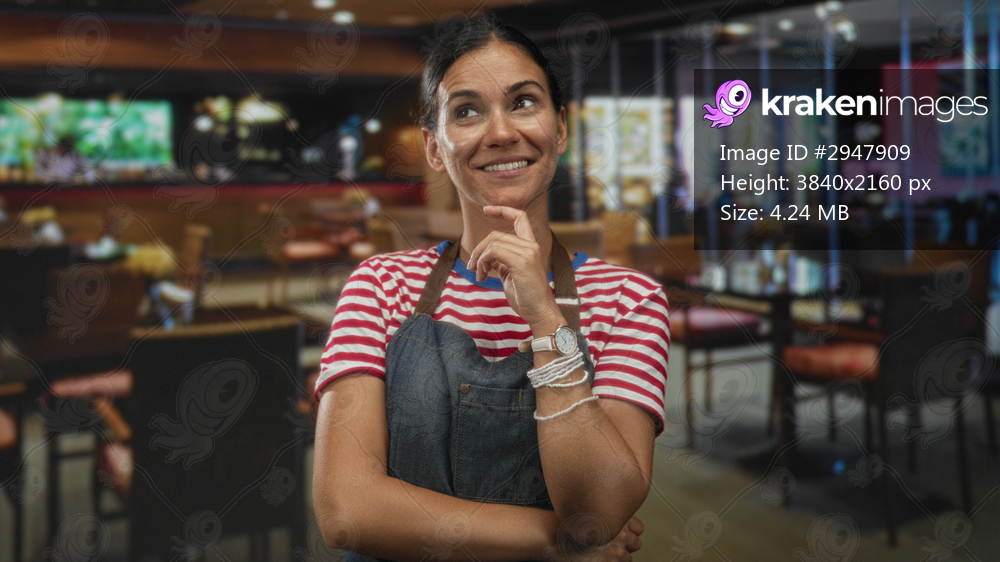 Woman touching chin and smiling, wearing denim apron and striped red shirt in a restaurant building interior; thoughtful planning.