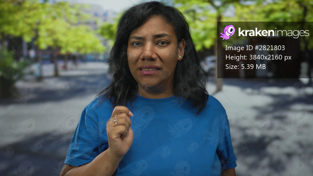 Woman touching chin with thoughtful gesture on sunlit city street near brick building and parked cars; inner concern.