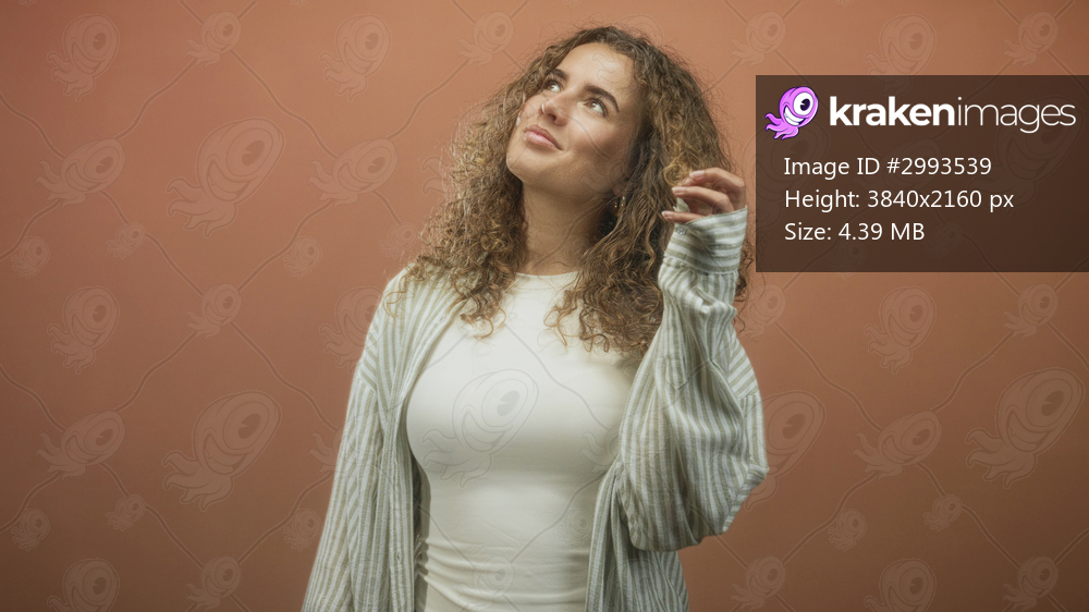 Woman touching curly hair and smiling in studio with coral backdrop, wearing white top and striped cardigan while tilting her head gently; serenity.