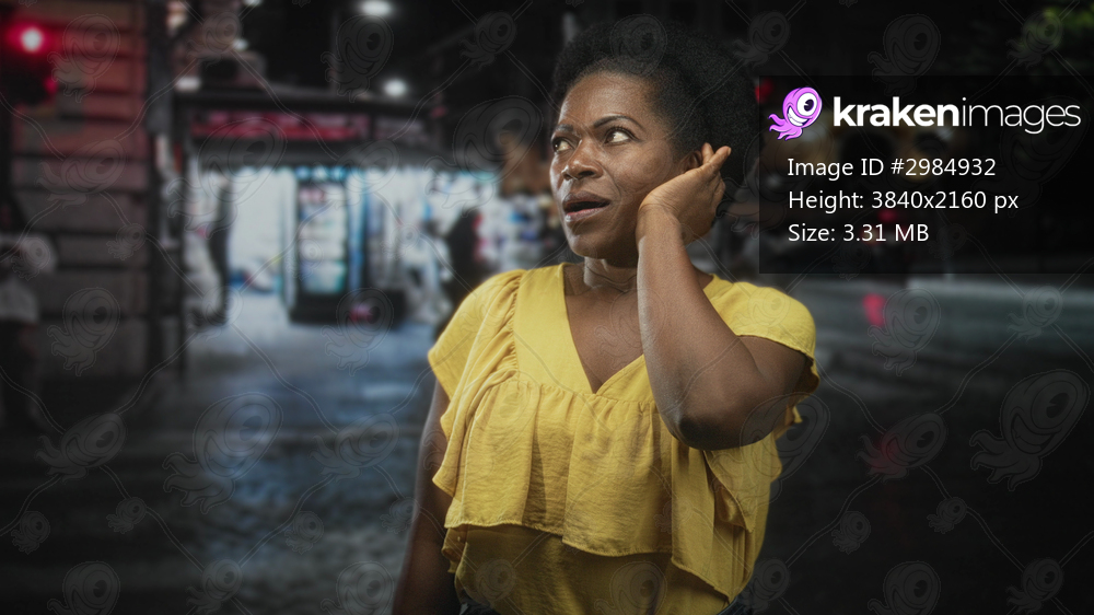 Woman touching ear with hand in yellow top on a night street near kiosk; surprise alertness curiosity.