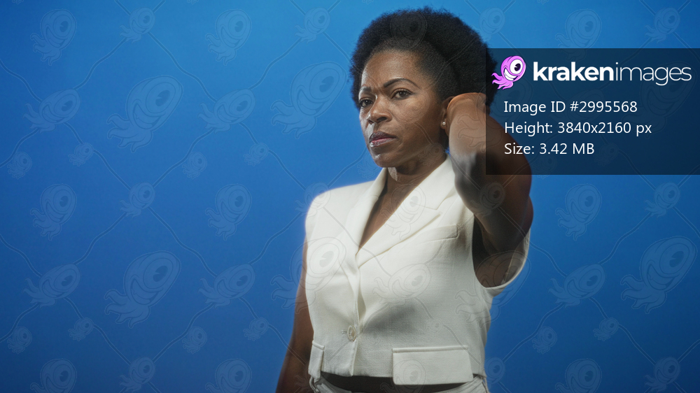 Woman touching ear with hand, wearing white vest and afro hair against blue studio backdrop; quiet contemplation resilience.
