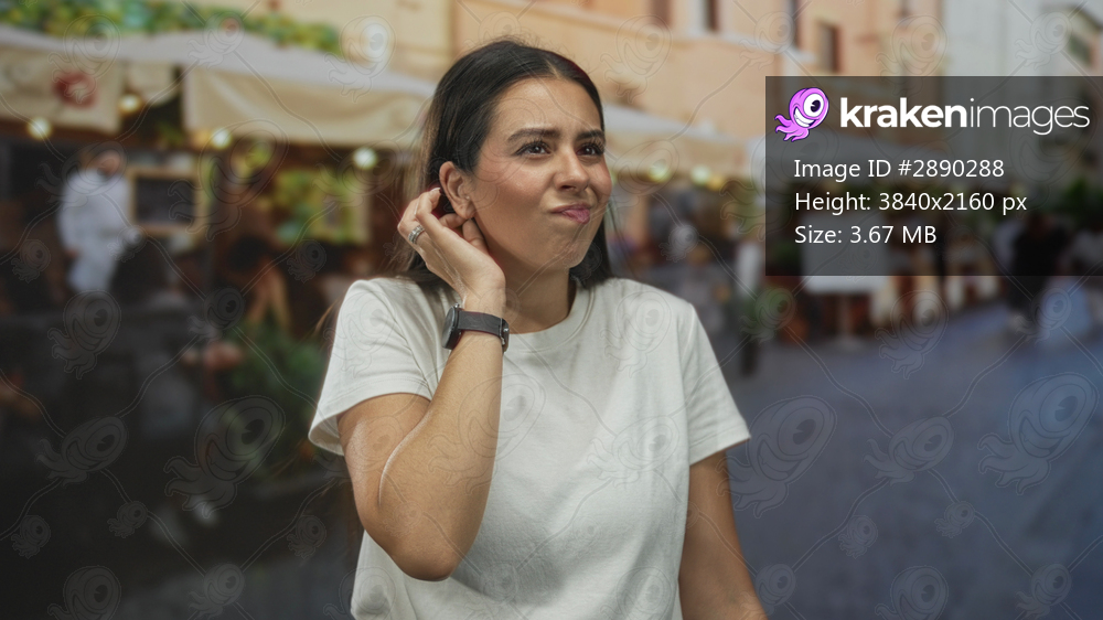 Woman touching ear with ringed hand and wearing smartwatch on street outside restaurant terrace with blurred diners and umbrellas; curious.