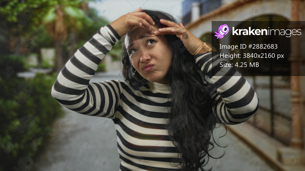 Woman touching forehead and checking skin at street entrance by building windows; concern self care.