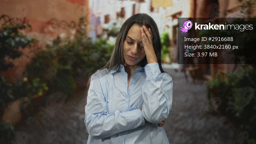 Woman touching forehead and chin with hand, face forward in a cobblestone street with plants and buildings; thinking pondering introspection concern.