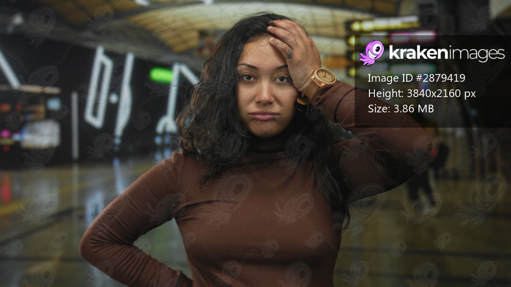 Woman touching forehead with hand and wristwatch visible in airport terminal, indoor concourse; frustration travel delay.