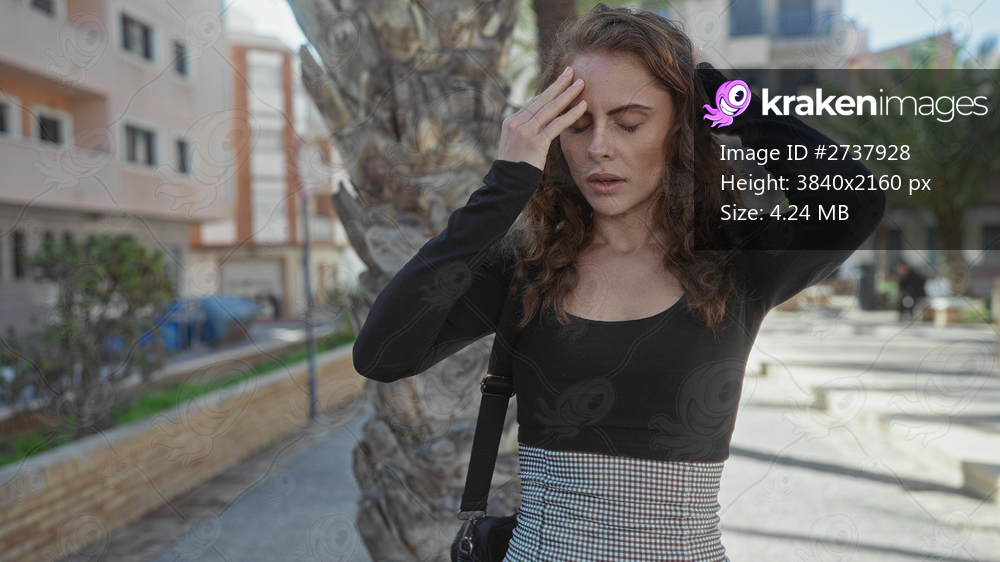 Woman touching forehead on city street with trees and buildings in the background depicting stress or headache outdoors.