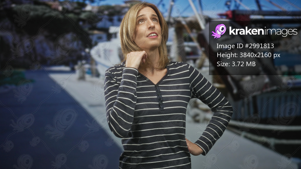 Woman touching forehead with one hand and holding her stomach with the other in front of a blurred boat and dock set in studio; thoughtful reflection.