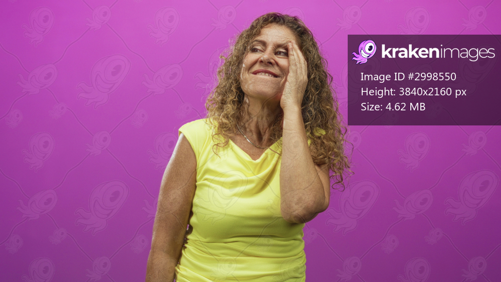 Woman touching forehead with right hand, smiling and peeking through fingers in yellow sleeveless top against magenta backdrop in studio; amusement.
