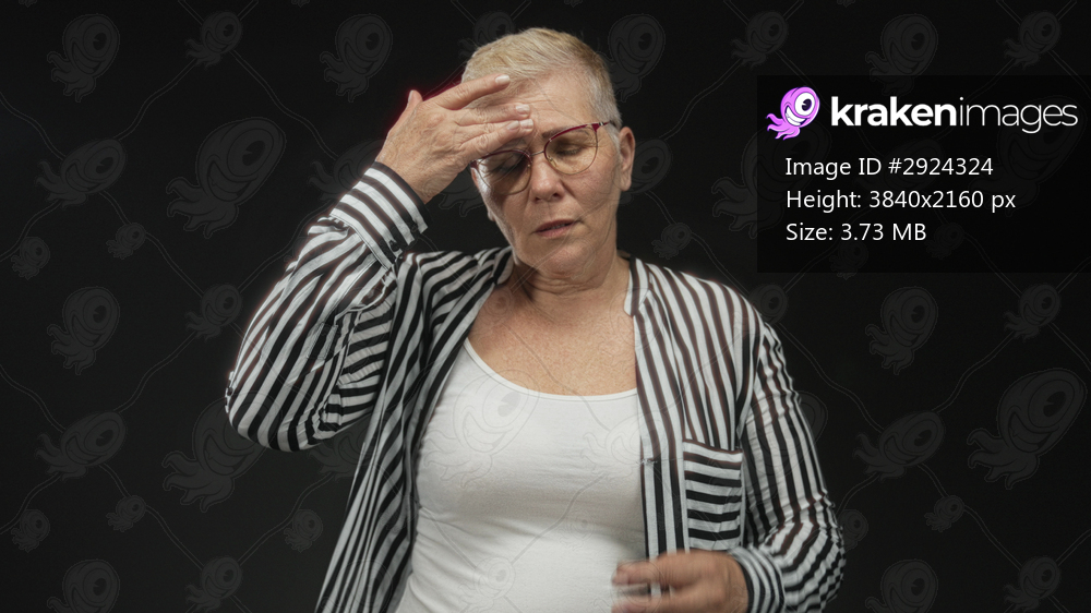 Woman touching forehead while removing glasses in studio with black background; fatigue concern relief.