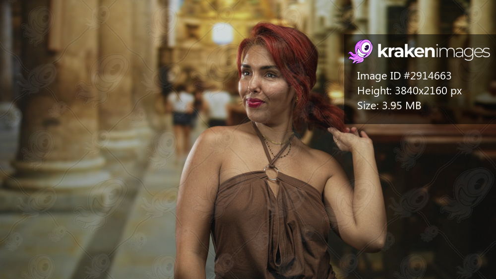 Woman touching hair with exposed shoulder and hand behind neck inside ornate church building; serenity quiet reflection.