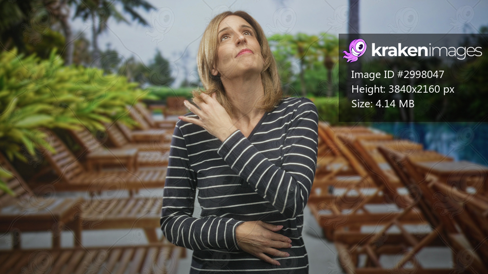 Woman touching hair with hand and holding her stomach beside wooden loungers at a pool inside a building, looking upward and slightly smiling; quiet contemplation. - Kraken Images