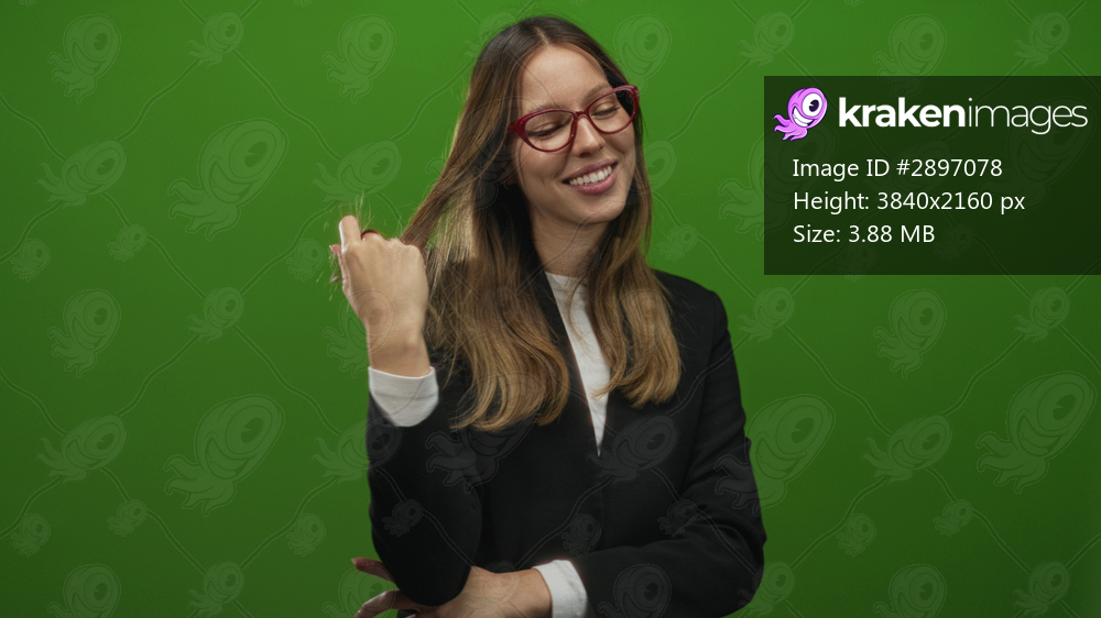 Woman touching hair with hand in studio with green backdrop, wearing glasses and blazer; confidence grooming.