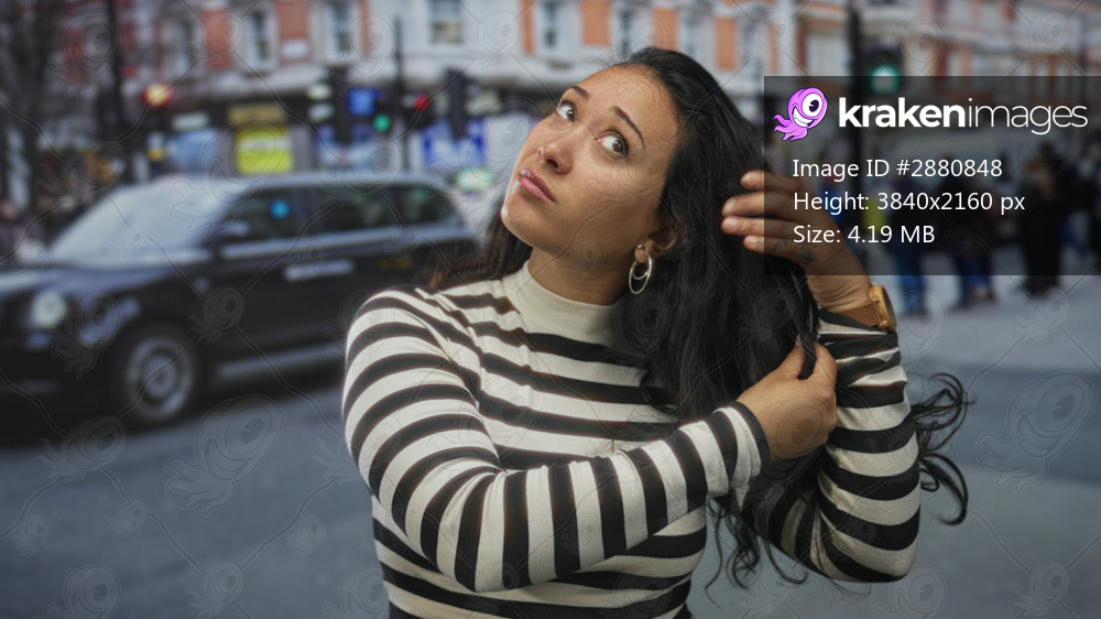 Woman touching hair with hand on busy street with pedestrians and traffic, looking skeptical and pursing lips; mild annoyance.