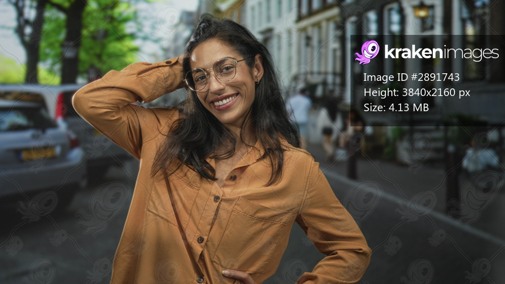 Woman touching hair with hand, smiling while wearing glasses and orange shirt, standing on street with parked cars and row houses; carefree joy.