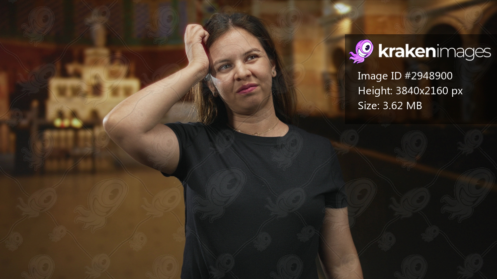 Woman touching hair with hand to head gesture inside a church building, wearing black tee with visible necklace and relaxed posture; quiet contemplation. - Kraken Images